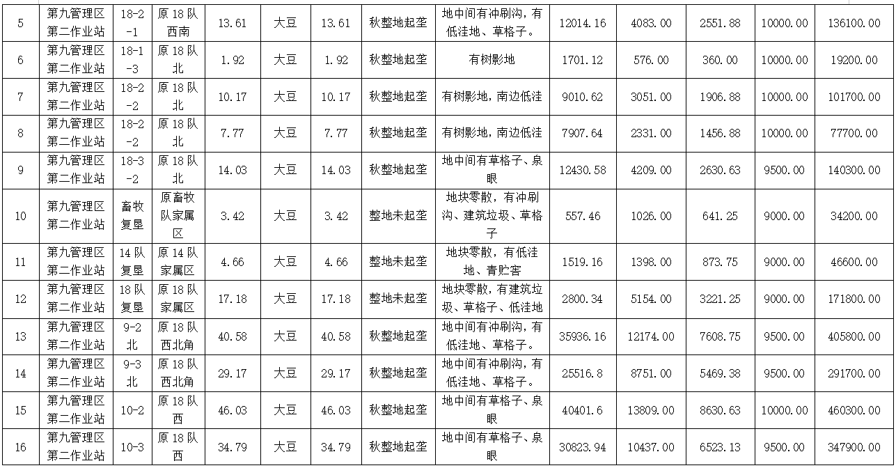 九個管理區(qū)共308個標的,土地面積約為5033.75公頃,參考價詳見明細表,起拍價6300.00元/公頃至11500.00元不等(詳見明細表),競拍保證金為10000.00元/公頃(詳見明細表)。