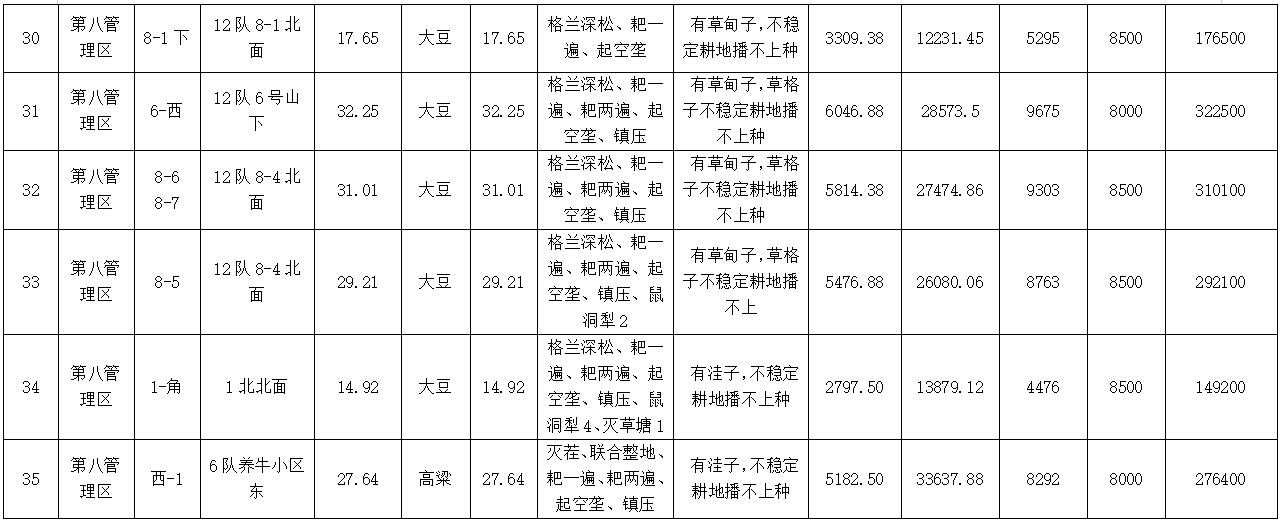 7、標的需按農(nóng)場要求種植作物,并禁燒秸稈和秸稈離田。若不按農(nóng)場有限公司要求種植作物或發(fā)生草荒、燒秸稈和未按要求時間秸稈離田行為的任何一項,按違約處理,保證金不予退還,同時追究違約責任,因此產(chǎn)生的各項損失、處罰及一切后果由買受人承擔。經(jīng)管理區(qū)驗收合格后,退返保證金。